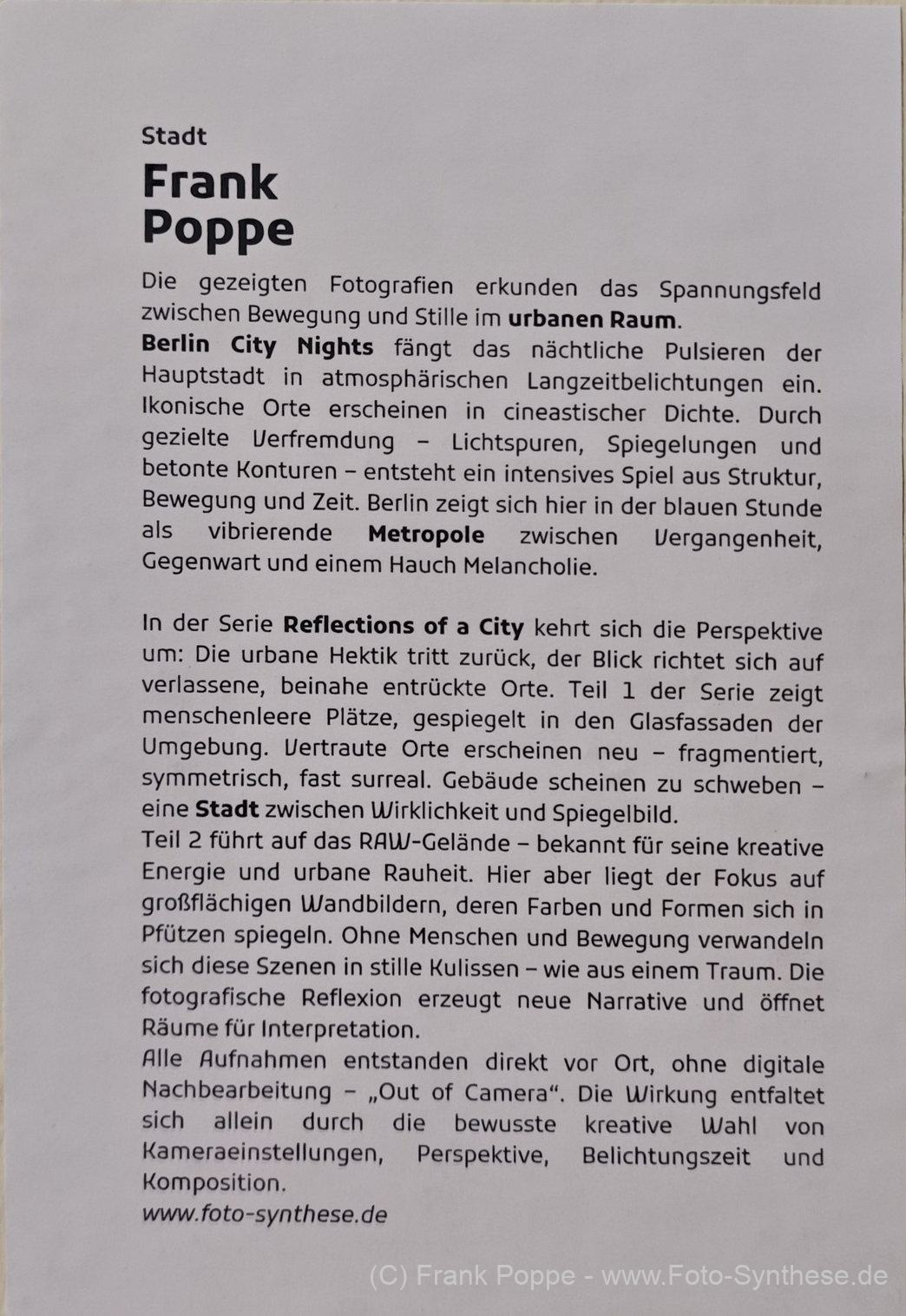 Bis zum Oktober 2025 sind einige Bilder von mir in einer Gemeinschaftsausstellung zum Thema Stadt in der VHS Berlin Charlottenburg-Wilmersdorf in der Prinzregentenstrasse 33-34 zu sehen.