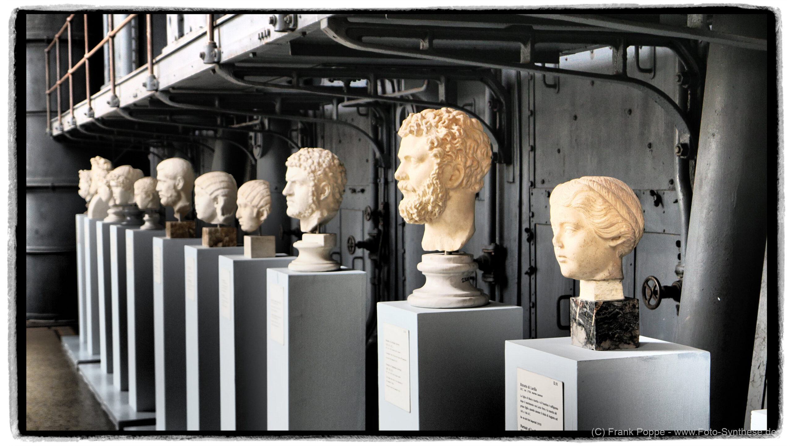 Heute sind dort bedeutende Skulpturen und Mosaike aus den Kapitolinischen Museen untergebracht. Für die Fotografie besonders interessant ist der Kontrast: filigrane Marmorstatuen stehen vor gewaltigen Dampfturbinen, dekorative römische Reliefs hängen zwischen Stahlträgern und Armaturen. Diese ungewöhnliche Präsentation eröffnet spannende Perspektiven zwischen Technik, Geschichte und Kunst – ein ideales Motivfeld für alle, die nach neuen Blickwinkeln in der Architekturfotografie und der Dokumentation von Kulturräumen suchen.